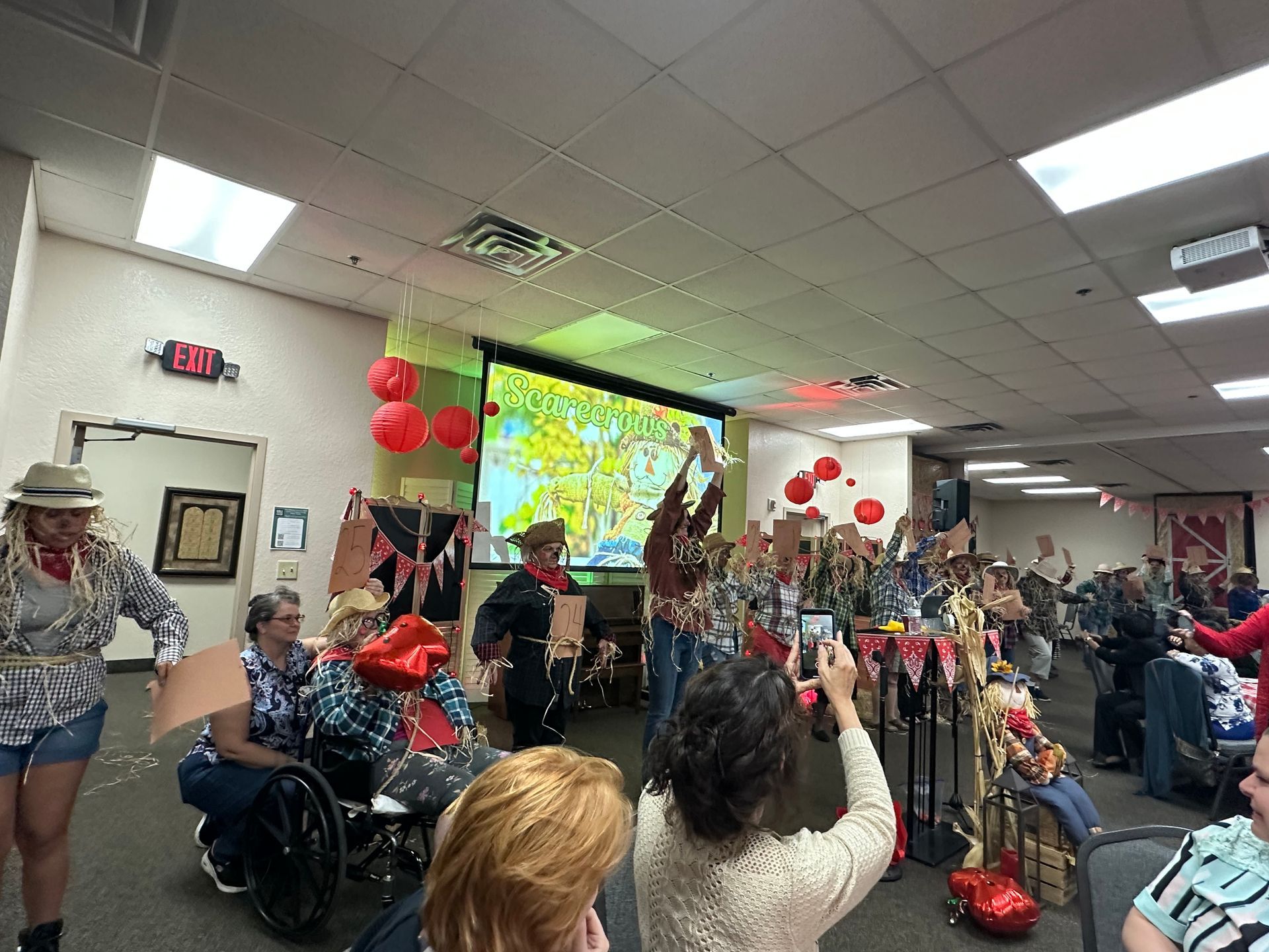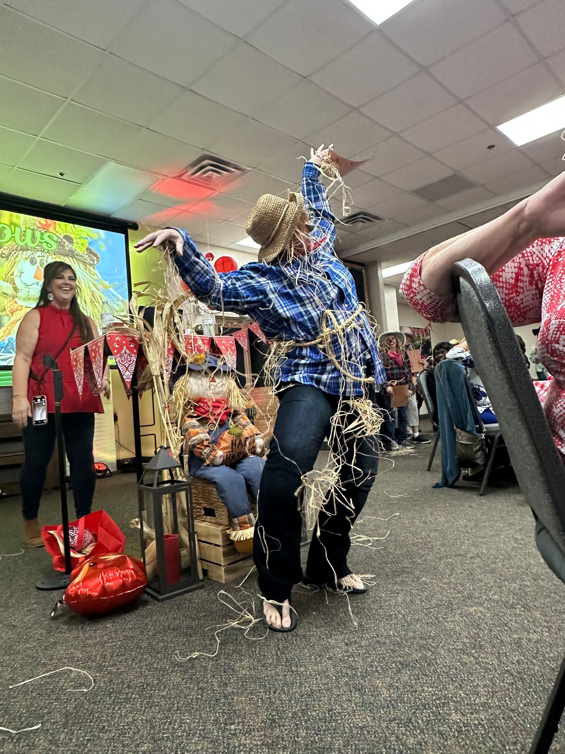 A beloved tradition at Friendsgiving is playing the “Stretchy Pants” song by Carrie Underwood, adding a fun and festive touch to the evening. Games were played, culminating in a scarecrow dress-up contest where volunteers modeled their costumes. Table number 17 emerged victorious!