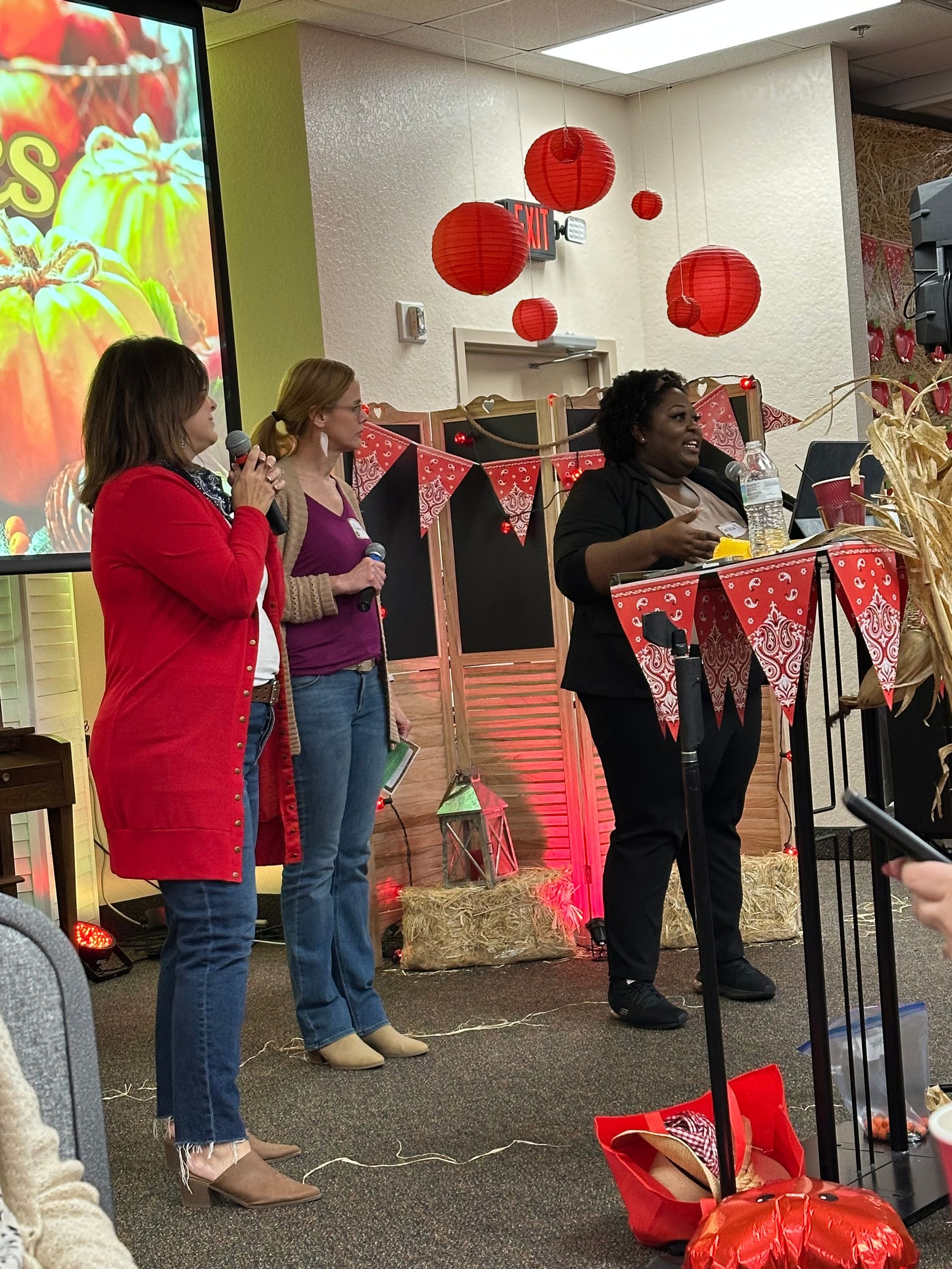 The hall was beautifully decorated with a fall theme, featuring red and white checked tablecloths, the sweet sounds of country fiddle music, and the delightful aromas of pumpkin pies, popcorn, and cider filling the air. The atmosphere was warm and inviting, setting the perfect stage for an evening of connection and celebration.